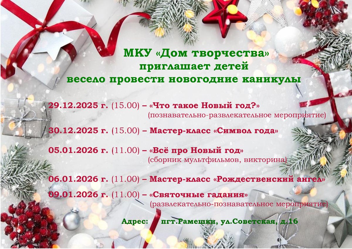 "Новогодняя мастерская" — серия мастер-классов по созданию новогодних сувениров с 22 - 26 декабря 2025 г. , МКУ "Дом творчества", 15.00.